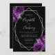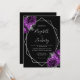 This elegant modern wedding invitation features a silver geometric frame decorated with plum and silver floral bouquets on a black background. The customisable text combines silver grey whimsical handwriting, copperplate and italic fonts. The reverse side provides space for wedding details on a solid black background, along with a QR code guests can scan to visit your website and RSVP, which saves the cost of printing and mailing separate RSVP cards.