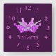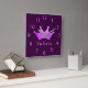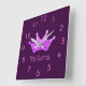 A pink and purple princess crown with shining stars against a purple background. Customise and add the girls name. Pink letters and clock numbers.