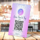 Make it easy for your customers to use contactless pay for your goods and services with this elegant, sophisticated, simple, and modern custom single QR code pedestal sign. Your custom logo, calligraphy script typography and purple blue glitter drips overlay a faux metallic purple blue ombre background. Personalise with your logo branding, personal QR code, and contact info with the customisable templates. Available in 4 sizes: 4”x6”, 6”x8”, 8”x10”, and 10”x12”. Makes a chic, professional, and stylish statement that will help your customers pay safely.