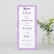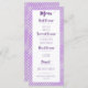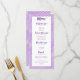 This elegant menu card has a purple quatrefoil background and purple script headers on a white decorative box. Perfect for letting your guests know what they will be eating!