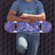 Purple and Blue colours and shape on a skateboard to make up an extraordinary design.