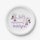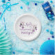 Birthday party plates featuring an illustration of a pair of roller skates with purple wheels, strings, and stars.