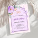 A blush pink background with a purple arch. Decorated with a pink floral, rose flower, green watercolored eucalyptus greenery and butterflies. Personalise and add your name and party details.