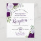 These affordable, budget friendly invitations are designed for guests who are invited to the reception only, and not the marriage ceremony. The elegant design features hand painted watercolor roses in shades of purple, lavender, and plum, with a bevy of eucalyptus leaves and greenery. The typography features fancy script calligraphy, and the back is a deep marbled burgundy colour. Perfect way to celebrate your wedding without spending a fortune on the invitations.