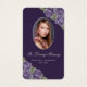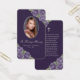Elegant purple and silver floral memory card/funeral prayer card featuring a photo adorned with purple roses and baby's breath flowers on a dark purple background.