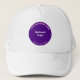 Business brand in purple round shape on customisable trucker hat. Customise it by uploading your business logo, typing your business name, city or town and state. You can include it in your promotional products, giveaway items or gifts to your customers or clients, a marketing strategy to advertise your business or to promote your brand. Customisable trucker hat that you can use to build brand name awareness. Please check the appearance after uploading logo and typing text. If the appearance is pleasing to you, you can place your order now. If you need to resize or reposition the logo and text, please adjust in the design tool. You can also change the font style, font colour and apply background colour in the design tool.