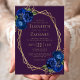 This design features a gold geometric frame decorated with royal blue watercolor floral bouquets and greenery, surrounding gold-coloured text on a deep purple background. The back of the card is a matching shade of purple.