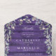 An all-in-one wedding invitation features a beautiful floral greenery cascade, elegant typography, and monogram initials on a background of rustic purple barn wood panels. The invitation includes a perforated RSVP card with your wedding website QR code and details. Designed by Thisisnotme©