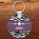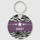 Trendy and modern Sassy Star Zebra Keychain featuring a chic black and white zebra print background and a bold purple border adorned with a fun star motif. This girly design may be customised with the personalised text of your choosing. Click "Customise It" to find more personalisation options.