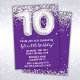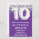 Purple and silver 10th Birthday party invitation age 10 birthday invitation with black white silver with modern script writing and fun foil balloons.