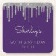 Purple Silver Glitter Drip 90th Birthday Party Square Paper Coaster