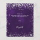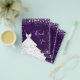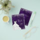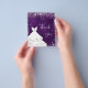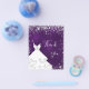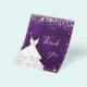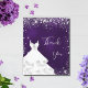 A feminine and elegant birthday thank you note. A purple, uneven coloured background colour. With faux silver glitter, sparkles and a white drerss. On front a large hand lettered script and the text: Thank You.
