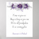 Purple, silver, gray, and lavender watercolor flowers "Come as you are; Stay as long as you can; We're all family here; So no seating plan" - personalize with your own name. If you would like this design on other wedding signs, please email me at shutterbug600@yahoo.com.