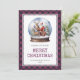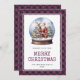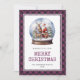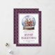 Custom purple buffalo plaid Christmas card featuring a snow globe with Santa Claus and reindeer. Easily personalise this watercolor purple Christmas card with your family name and the year.