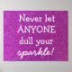 A lovely poster with the phrase "Never let ANYONE dull your sparkle" on a purple glitter background.