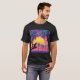 A vibrant purple squirrel balances on a palm trunk, overlooking rows of bright teal palms and a glowing yellow sun. The pink and orange sky and cyan grid sea give this illustration a playful 80s arcade energy. Perfect for animal lovers and fans of bold, colorful synthwave artwork.
