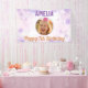 Purple Stars Girly Happy Birthday Photo Party Banner. Celebrate your little one's special day with this enchanting purple and pink birthday banner! Featuring a magical design with floating stars and shimmering bubbles, this customizable banner is perfect for a girl's birthday party. Personalize it with her name, age, and a cherished photo to create a memorable decoration that will delight guests and make her feel extra special. Ideal for birthdays, photo ops, and creating a festive atmosphere. A joyful way to mark her birthday!