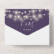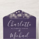 All in one modern minimalist wedding invitation featuring pretty string lights and elegant signature script name and monogram initials on a purple background. The invitation includes a perforated RSVP card. Designed by Thisisnotme©