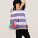 complete your signature collection with this pastel purple broad striped floral background tote bag. initial enclosed in geometric border with colourful water colour floral bunch. hit personalise button to add your initial or your text.