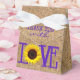 Add a modern chic wedding shower favour to your special day. This pretty little favour box is in a popular rustic country burlap background IMAGE with the word "LOVE" using a yellow sunflower and purple text. Text on back "Thank you for sharing my day!" with the brides name and a purple heart. A white ribbon makes this elegant bridal shower guest favour perfect for a barn wedding. This little box is the right size for a gift card. Perfect for your bridesmaids gifts. Personalise with the bridesmaids name on back of box. Don't forget to add one for your mother and mother-in-law to be. Congratulations!