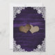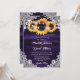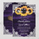 Elegant purple and sunflower wedding invitation featuring sunflower flowers, string lights and delicate floral lace against a rustic wood background. Matching items available.