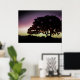 Impressionist scene of a leafy oak tree in a field, silhouetted against a urple green sky at twilight