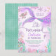 Sweet purple and teal mermaid themed birthday invitation for a girl featuring a mermaid tail, sea turtle, coral, sea chest and more. This under the sea mermaid birthday invitation is ideal for a girls under the sea mermaid themed birthday party.