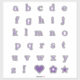 Gorgeous purple lower case font typography monogram letters alphabet sticker pack for monogramming, personalising, customising, note writing, journals, notebooks, and more. This set also includes an exclamation point, heart, flower, and star.
