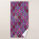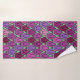 This towel set has a light purple washcloth, a darker purple hand towel and a bath towel with an art deco design of tulips from pentagons and trapezoids in different shades of purple.