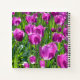 A bed of pretty purple tulips with sunlight casting shadows in the petals welcoming spring. Pond in the background.
