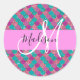 Girly and glam purple, lilac, aqua, turquoise and green mermaid glitter sparkles monogram name and initial classic round sticker. Your custom name and monogram are written in an elegant hand lettered script with a pink background. A perfect birthday or Christmas gift!