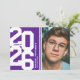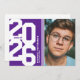 Modern purple graduation party invitations featuring an eye-catching class year layout in a varsity font, a photo of the grad, two white stripes, their name, school, and an easily personalised party invite template, these sporty invites will make your celebration a memorable one.