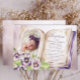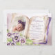 This design is unique in that it is created within the pages of a book with an arched photo of your little one to the left nestled among a bed of purple violets. The invitation rests on the book page to the right with a gold tone trinity cross in the top right corner. An aging effect has been applied to the overall look ofthe design (except for the photo) to give a time-worn appearance to the design. The background is a dusky purple subtle faux glitter effect which has also been applied to the back. Back is overlaid with tiny polka dots in muted gold tone. Composite design by Holiday Hearts Designs.