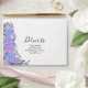 This design features a clean white background beautifully framed with watercolor-style floral arrangements in shades of lavender, violet, and soft blue, accented with green and muted foliage. The cool-toned blossoms add a fresh, elegant, and romantic touch. All written details on the design are fully customisable, making it easy to personalise for your needs.