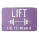Something to inspire you to workout each morning. The bold and modern design features a purple bath mat with a barbell icon and the quote Lift Like You Mean It in a distressed white typography.