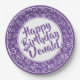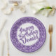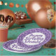 This over-the-hill design has a purple and white random number pattern with a white milestone number 85 repeated in varied sizes and angles over a purple background. There is a white circle in the centre for your text and purple and white rings around the rim.