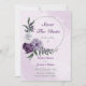 Beautiful botanica save the date card featuring purple lavender and white flowers with green leaves on a green circle forming a pretty romantic wreath.
