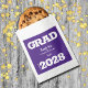 GRAD and your class year in bold white letters with your name and thank you message in the middle on a purple background or any school colour. Lots of colours done for you and MATCHING items in our store.