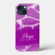 Bright animal patterned iPhone case in bold purple hues. Personalise this item with your full name. This example currently reads Skye Jackson. This original pattern by Sarah Trett is based on the patterning found on a giraffe with a halftone moire dot gain pattern overlay created for www.mylittleeden.com on Zazzle.