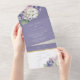 This romantic floral wedding invitation features watercolor purple and white hydrangeas over a dusty purple lavender coloured background. A delicate bouquet of hydrangea flowers is pictured on the front, and two on the inside portion.