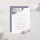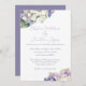 This romantic floral wedding invitation features watercolor purple and white hydrangeas. A delicate bouquet of hydrangea flowers is pictured on the top, and another at the bottom.