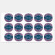 Stylish, trendy dark purple, white, teal blue tilted stripe pattern in the background, topped with a teal blue label featuring a customisable name and monogram template.