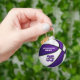 This cool basketball themed keychain features the image of a realistic basketball with alternating purple and white recolored panels - easily customise with school name, mascot name and player name & jersey number - by katz_d_zynes