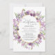 Purple Wildflower Baby Shower Invitation. This is an invitation to a baby shower with a gold romantic wreath of greenery and purple lavender wildflowers. Matching games are in the Purple Wildflower Baby Shower Collection.