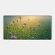 Sunlight bathes a morning meadow with purple wildflowers casting a serene and warm glow