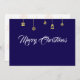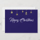 Greeting wish card Merry Christmas written in English in mauve font with golden christmas symbols on a purple background - editable text and background