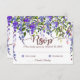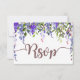 Purple wisteria floral drop over white background front design with wreath over lavender background back design modern inspired RSVP card.