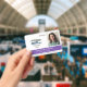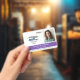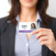 Horizontal employee ID badge personalised with photo and logo, name and title, and badge number and expiration date. Add name and title in white on purple.