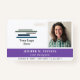 Horizontal employee ID badge personalised with photo and logo, name and title, and badge number and expiration date. Add name and title in white on purple.