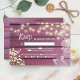Celebrate the magic of love with our captivating "Purple Wood String Lights & Lace Wedding RSVP Card!" This charming card features a delightful combination of string lights, baby's breath, and lace details on a charm purple wood background. Customise it with your event details and request a timely response from your guests. Ensure a seamless planning process and make your guests feel involved in your special day!